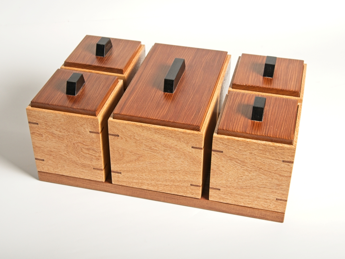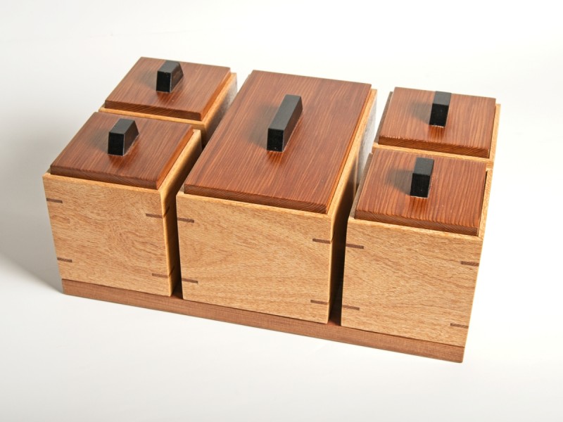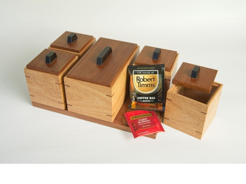 295 x 180 x 120. Silky Oak (Grevillea robusta), Western Red Ceder (Thuja plicata) and Ebony (Diospyros celebica) grips. Set of four tea bag holders and one holder for coffee bags. Set onto base tray. Price $700